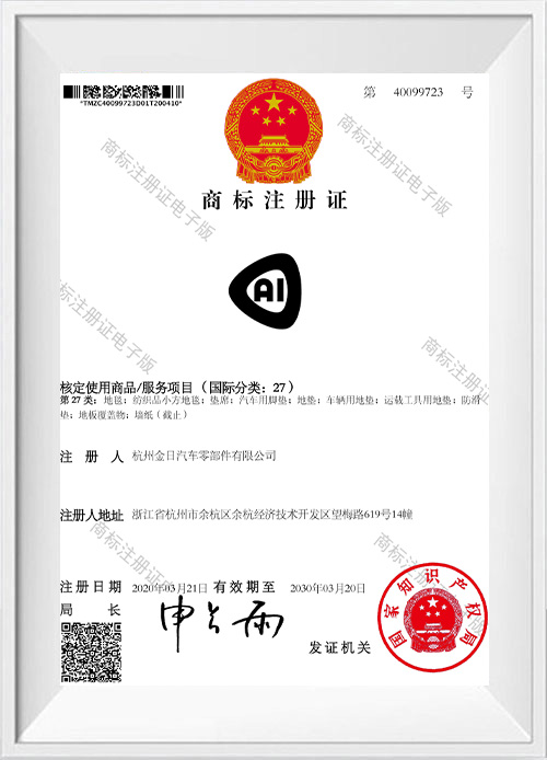 Certificat de înregistrare a mărcii comerciale pentru covorașe pentru picioare